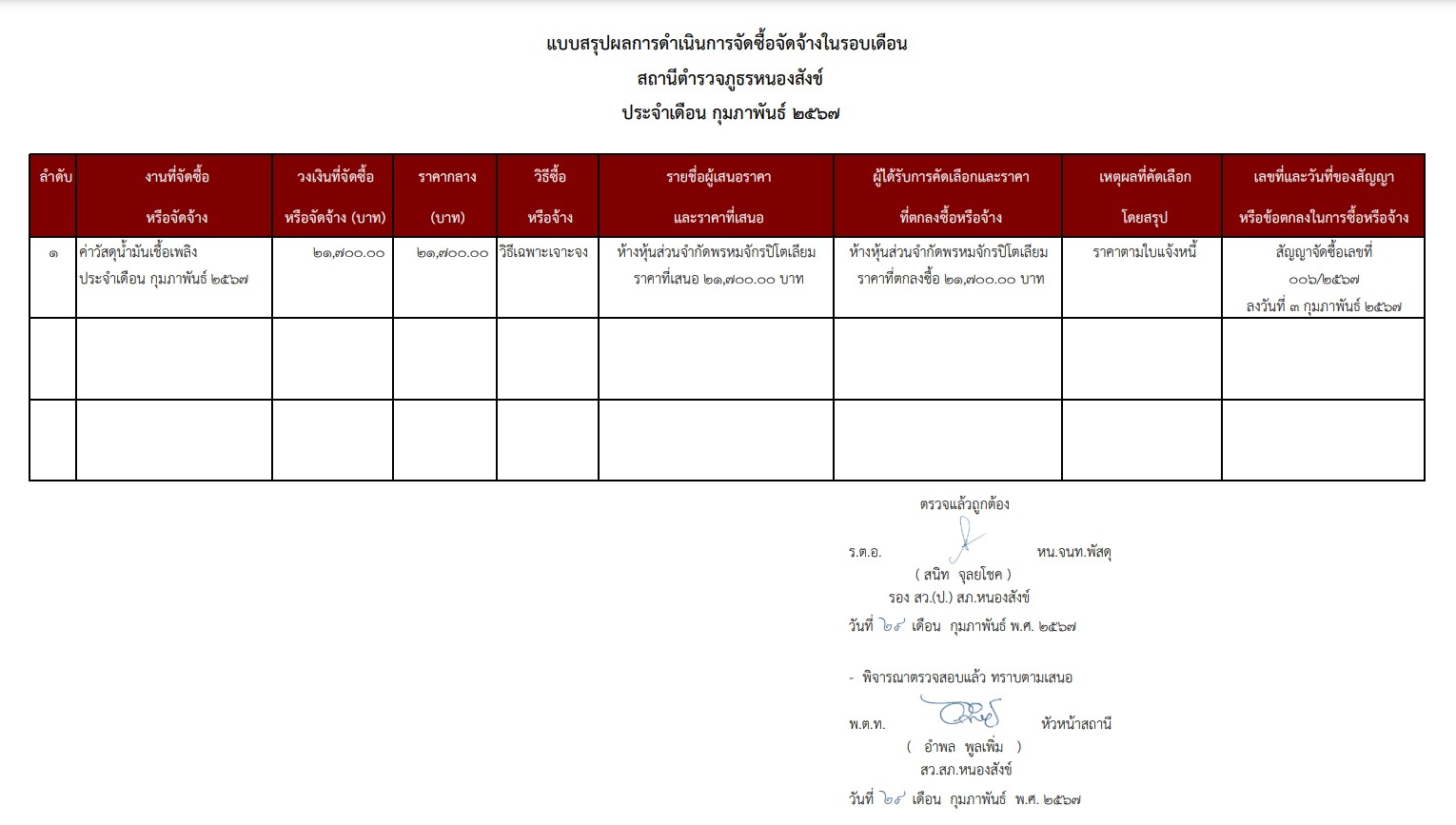 สรุปผลการจัดซื้อจัดจ้างประจำเดือน กุมภาพันธ์ พ.ศ. 2567