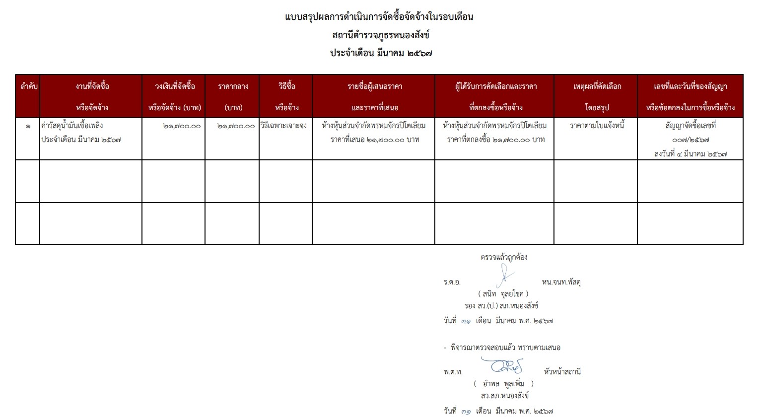 สรุปผลการจัดซื้อจัดจ้างประจำเดือน มีนาคม พ.ศ. 2567